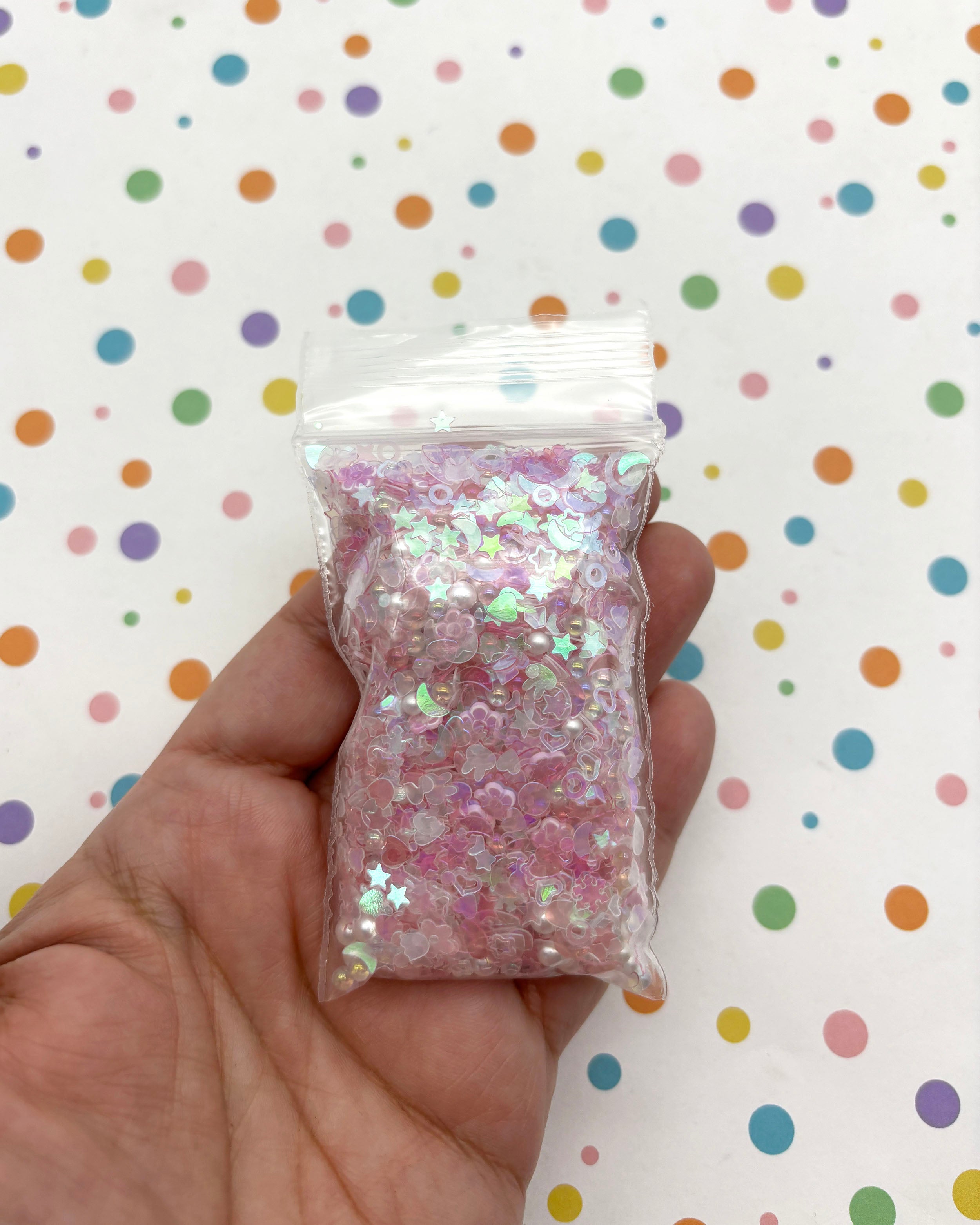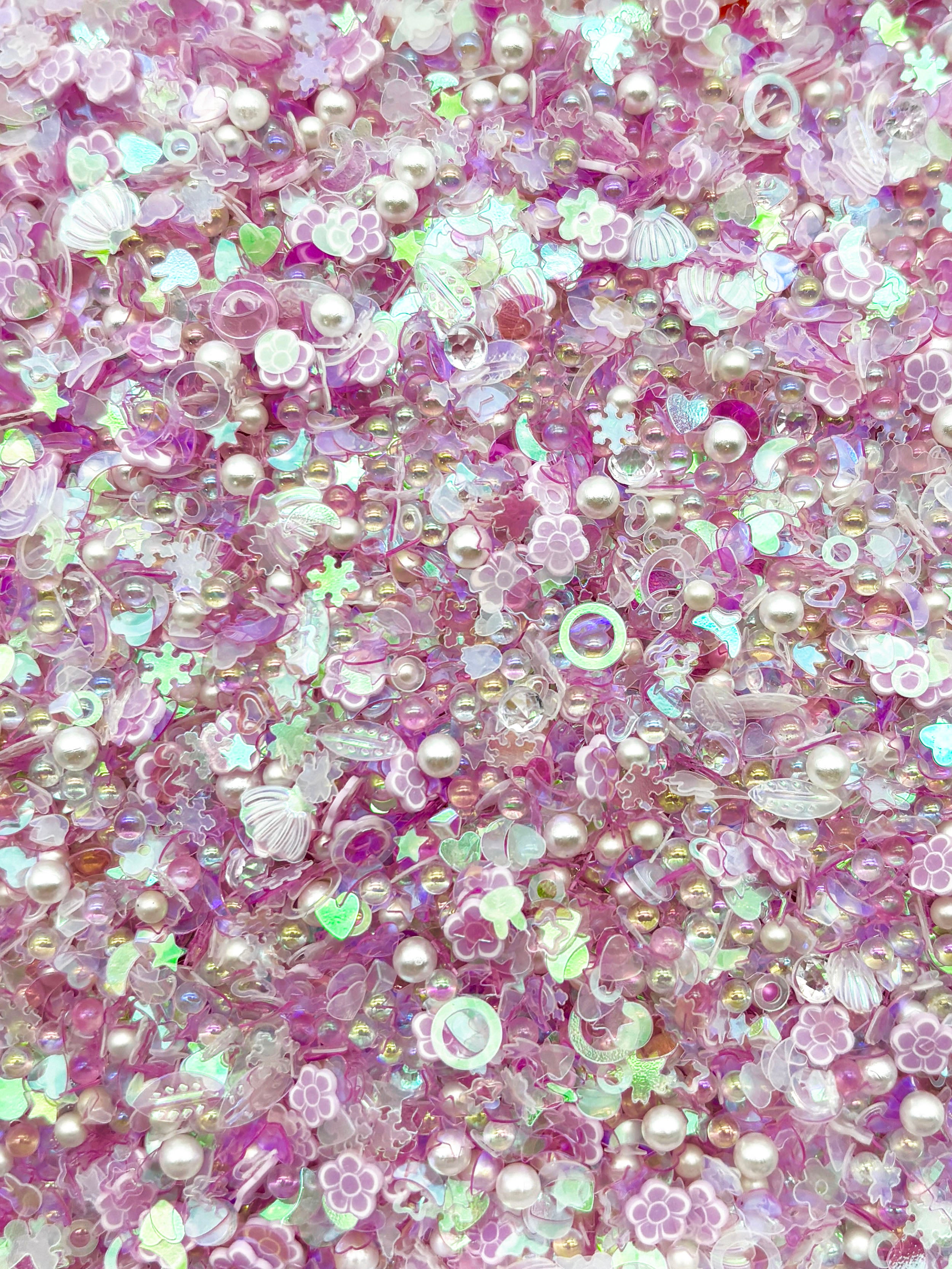 This Pastel Lavender Purple Glitter, Polymer Clay Flower, Clear Round Glass, Pearls and Rhinestone Non Edible Shaker Mix is a versatile sprinkle blend designed to enhance your craft projects with vibrant colors and unique textures. This craft sprinkle mix is perfect for hobbyists looking to customize slime or create stunning decoden phone cases. It also works well as a snowglobe tumbler glitter additive or as an embellishment for DIY jewelry. The combination of textures from polymer clay flowers to shiny rhinestones ensures your creations stand out with professional polish. You will get a 2x3 inch 30g bag!