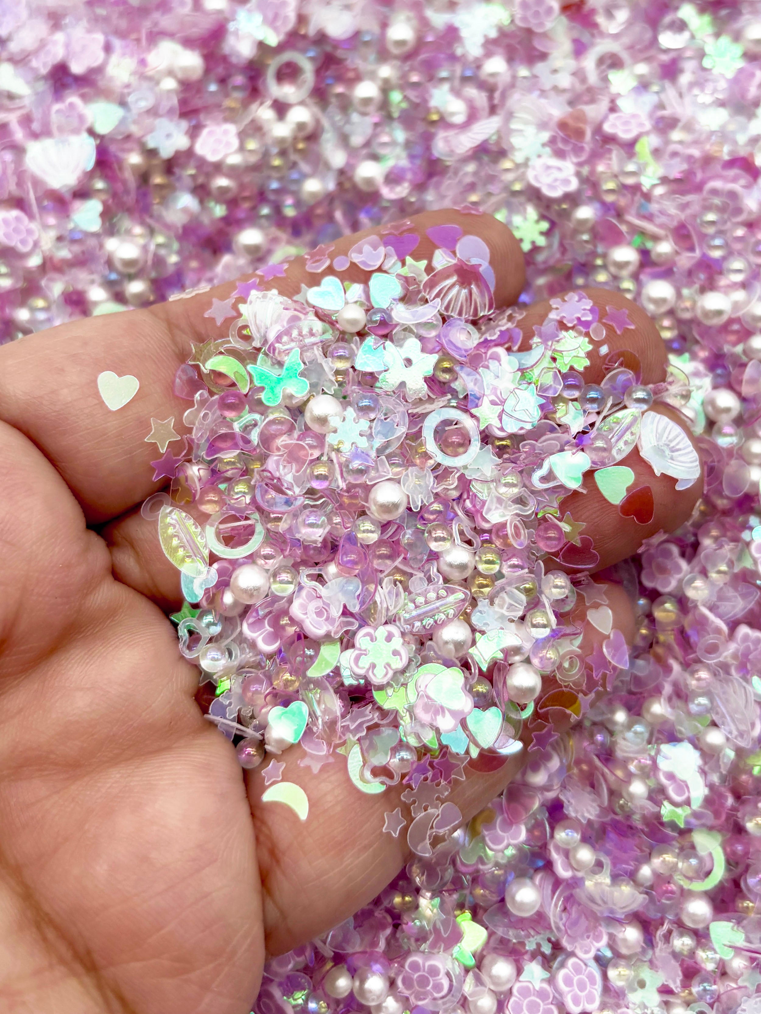 30g Pastel Lavender Purple Glitter, Polymer Clay Flower, Clear Round Glass, Pearls and Rhinestone Non Edible Shaker Mix G125