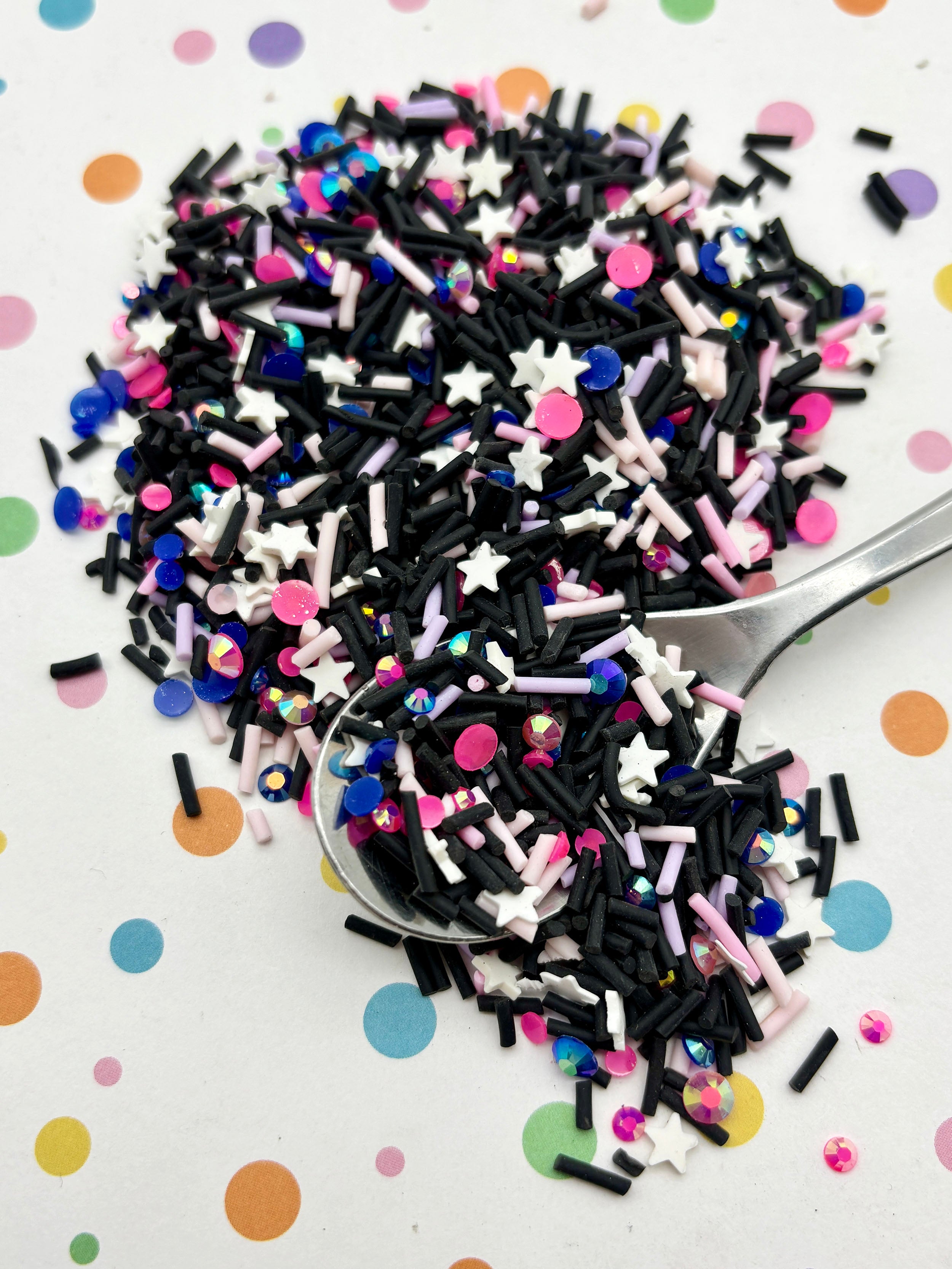 ASTERIA MIX Black with Pastel Sprinkles, Assorted Rhinestones, and White Stars, Polymer Clay Fake Sprinkles, Decoden Funfetti Jimmies K84
