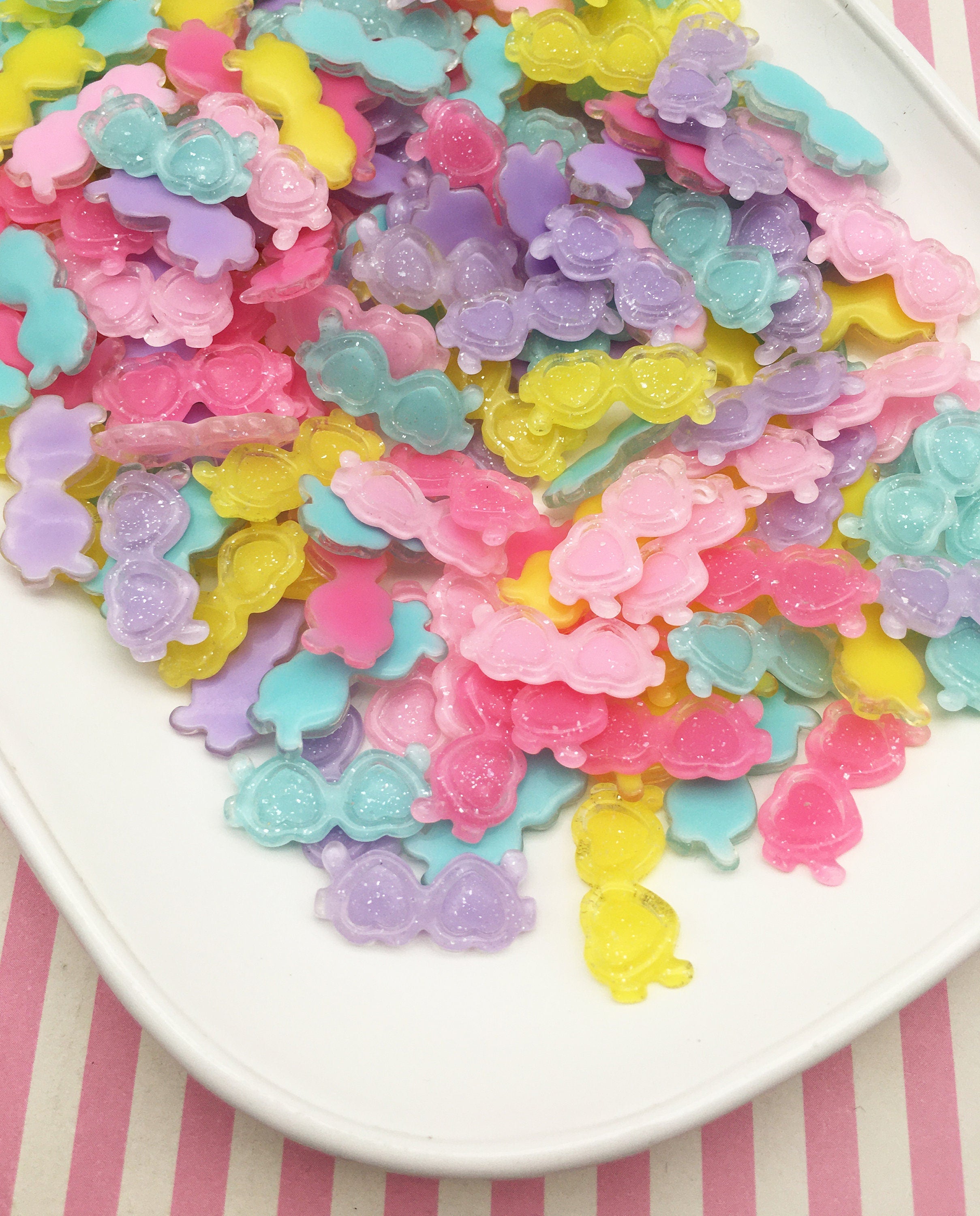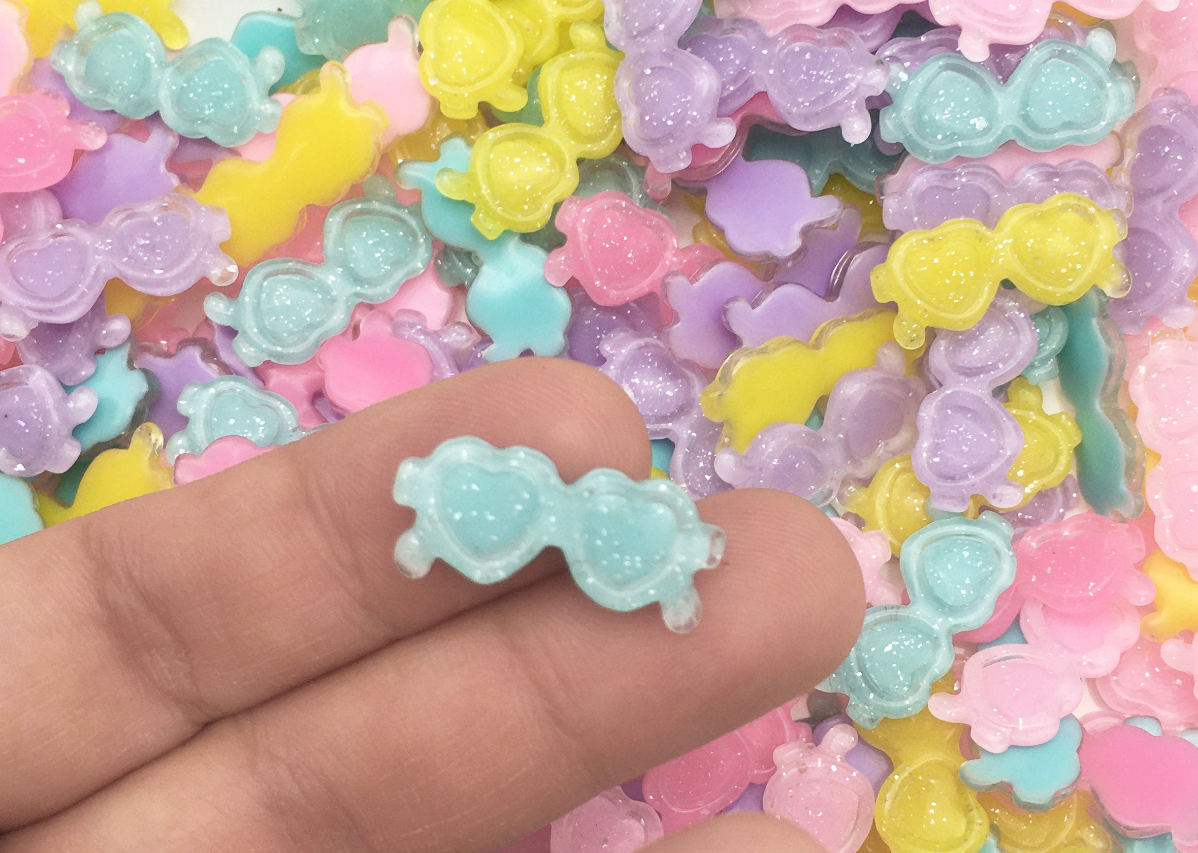 These are fun small heart shaped sunglasses cabochons. They are 23x10mm. They come in an assortment of pastel glittery colors.
