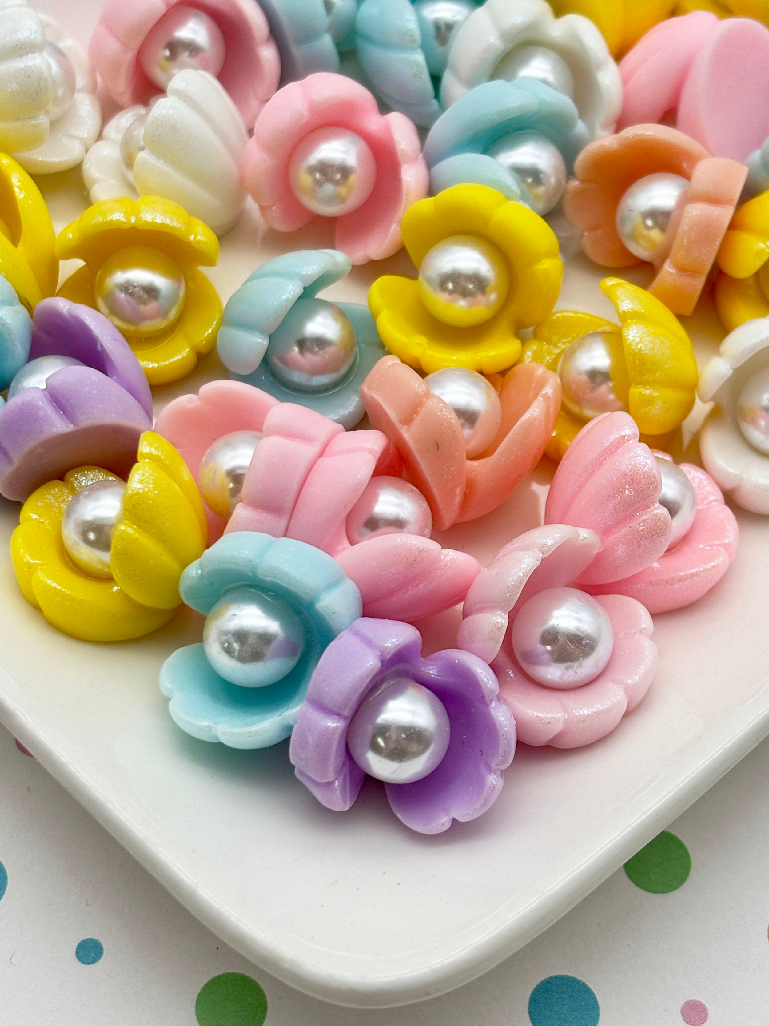 How cute are these charming open seashell cabochons, crafted from glittery resin and featuring a delicate pearl nestled inside? Each cabochon measures 19x19x20mm, making them a perfect addition to your creative projects. With a flat bottom design, these versatile pieces are ideal for jewelry making, decoden crafts, and costume embellishments. You will receive a set of 8!