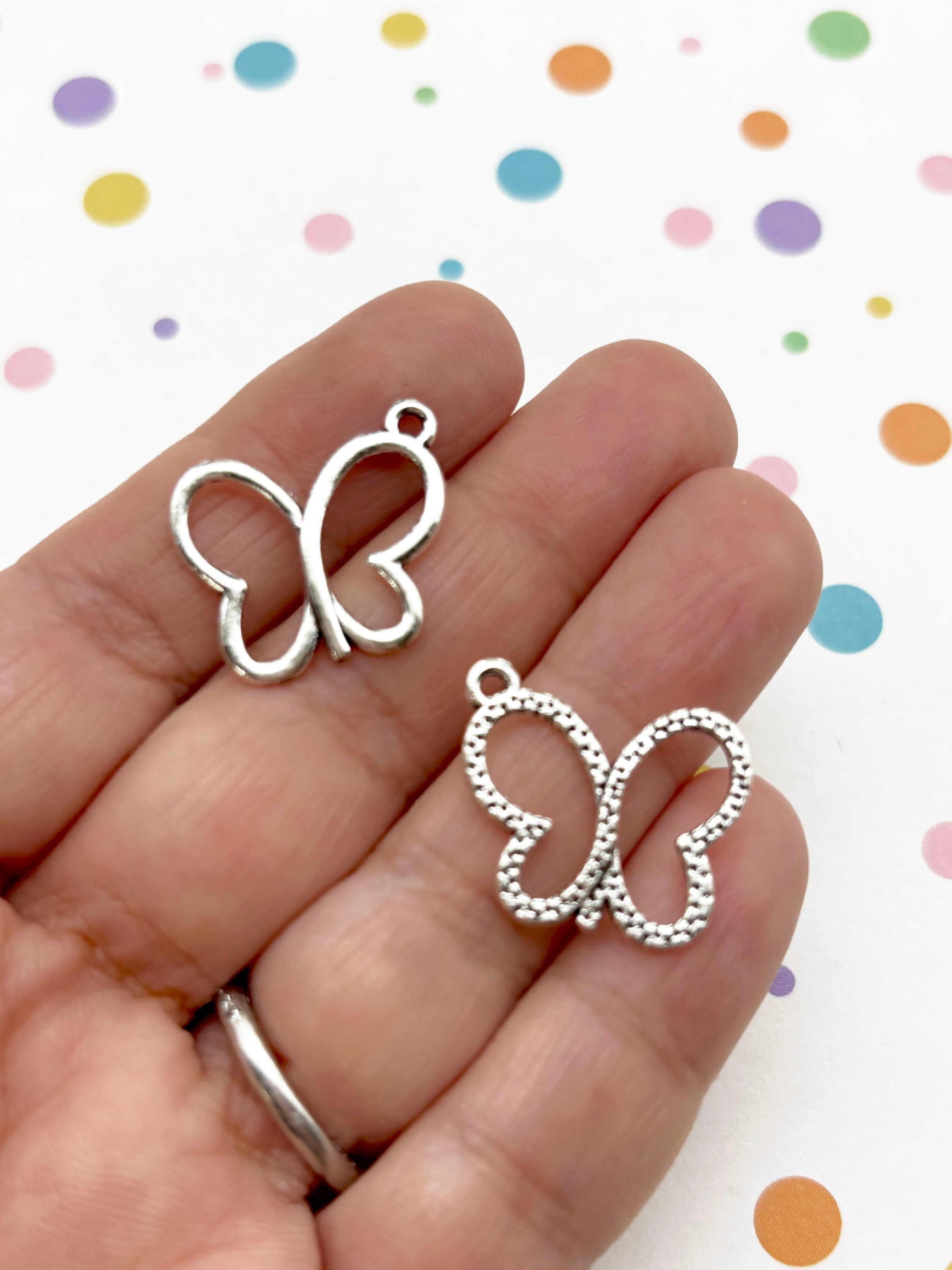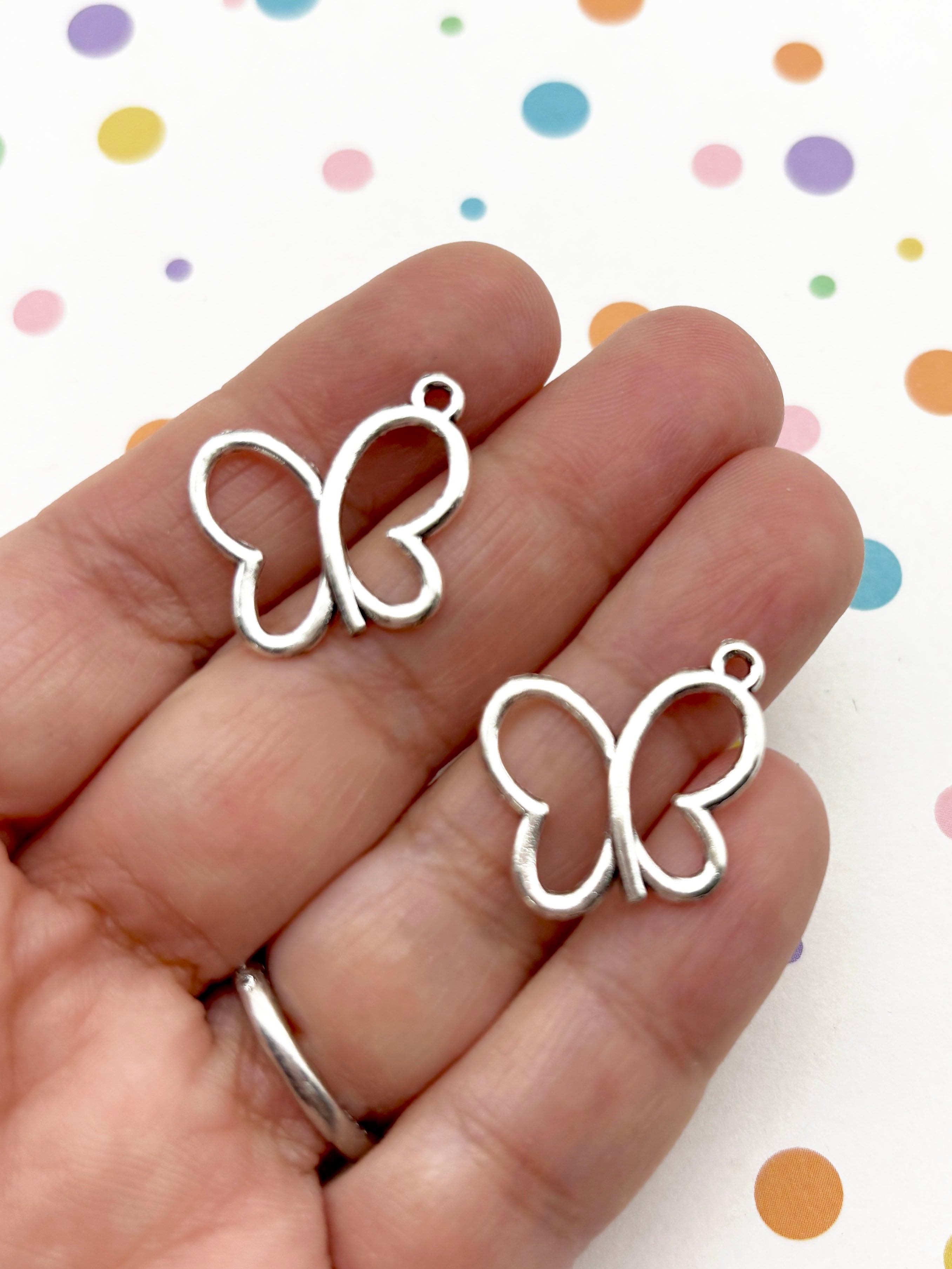 These are silver plated open bezel butterfly pendants. They are 17x18mm. You will get 8 pieces. You can use these to fill with resin. Just add colorants, glitter and you'll have a fun pendant. We sell tons of resins in different colors as well as glitters and other decorations to fill these with!