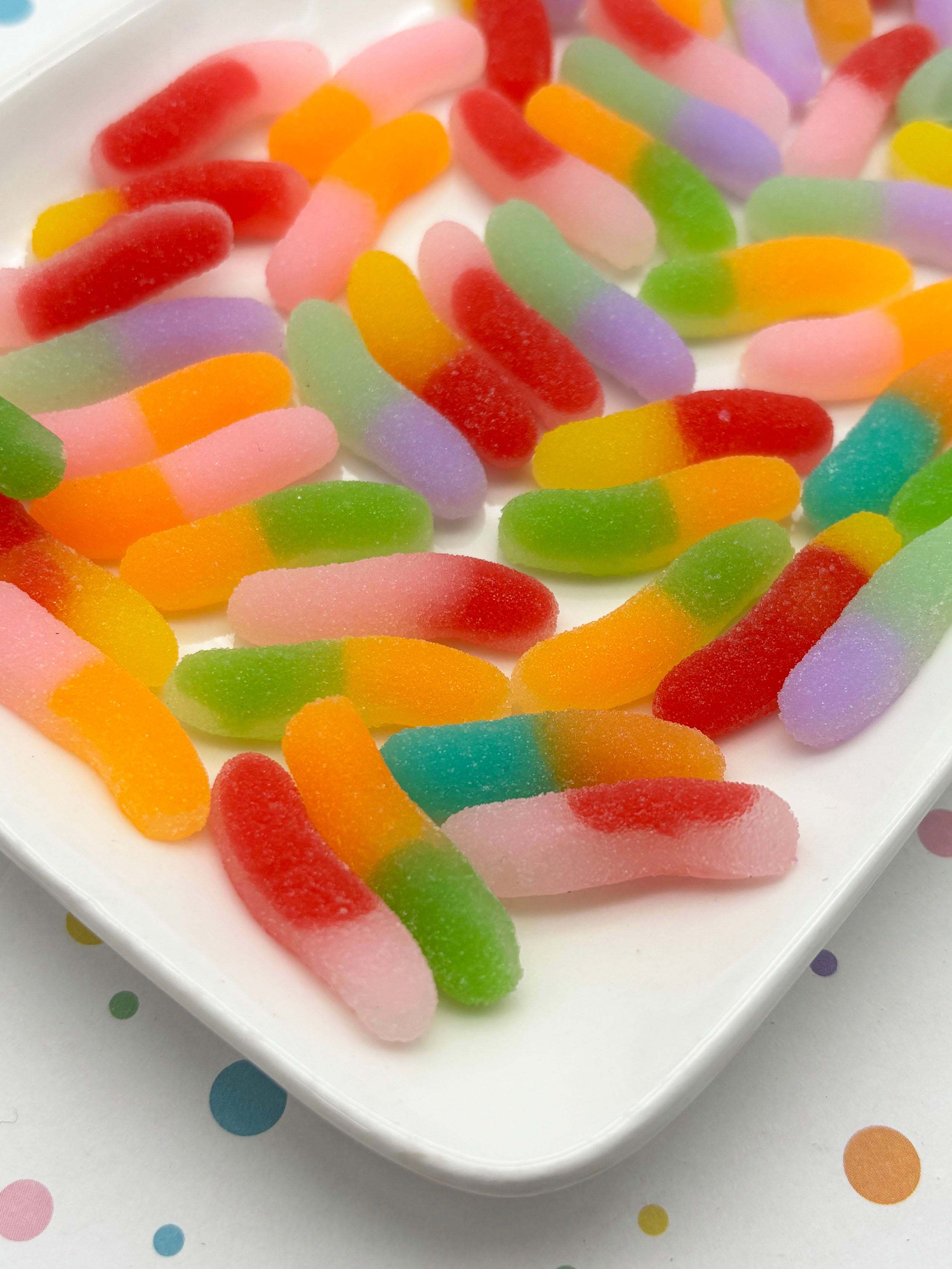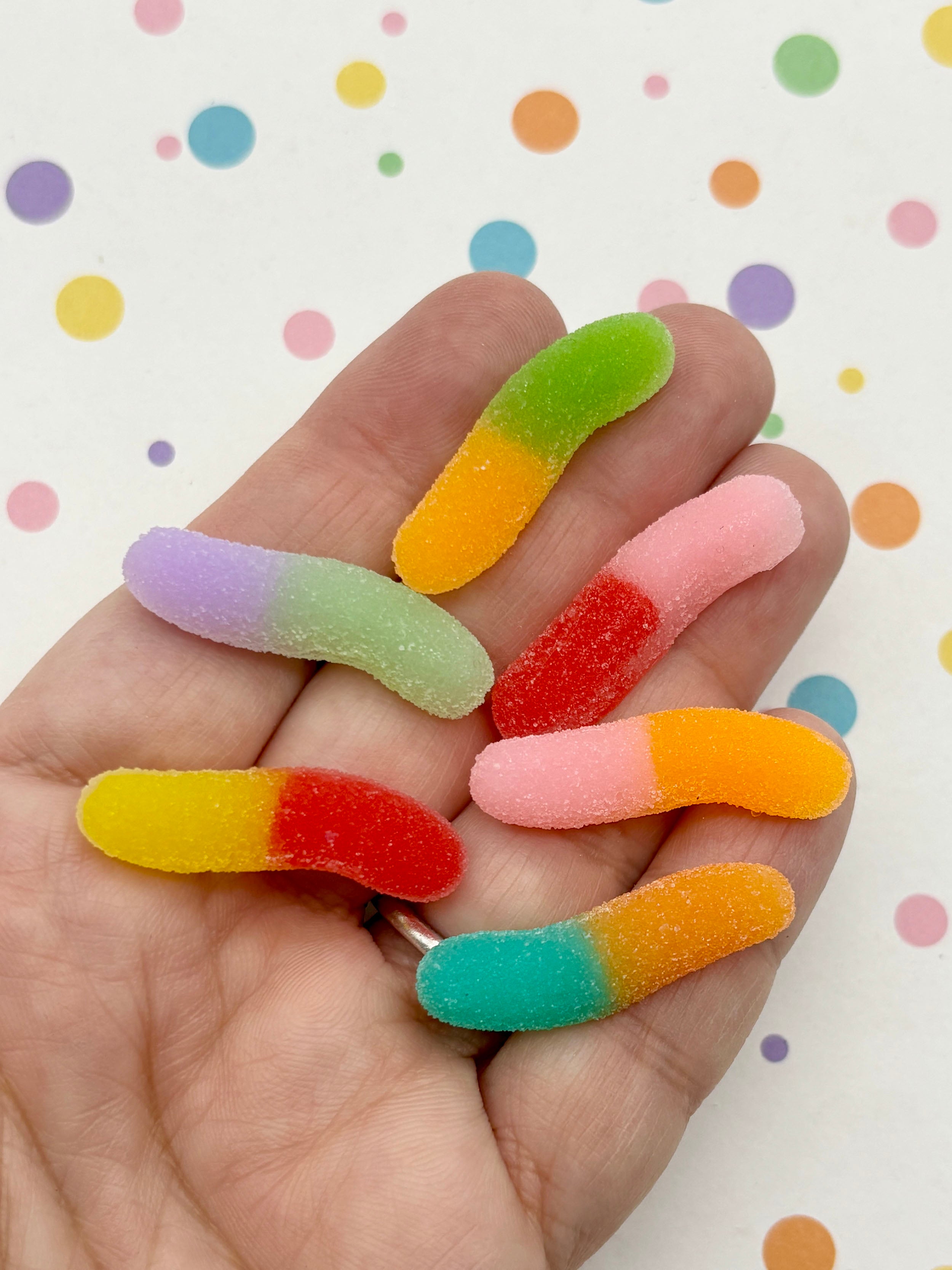 6 "Sugared" NON EDIBLE Resin Flatbacked Multicolor Gummy Worm Cabochons, Flat Backed Acrylic Plastic Gummi Candy Cabs 039a