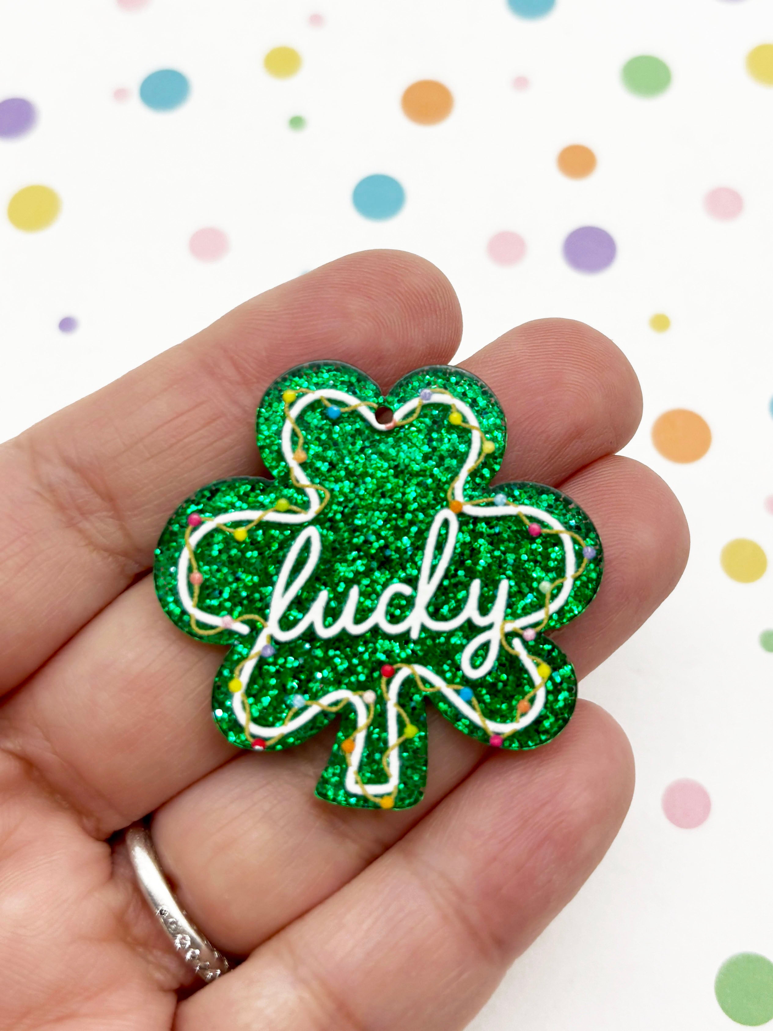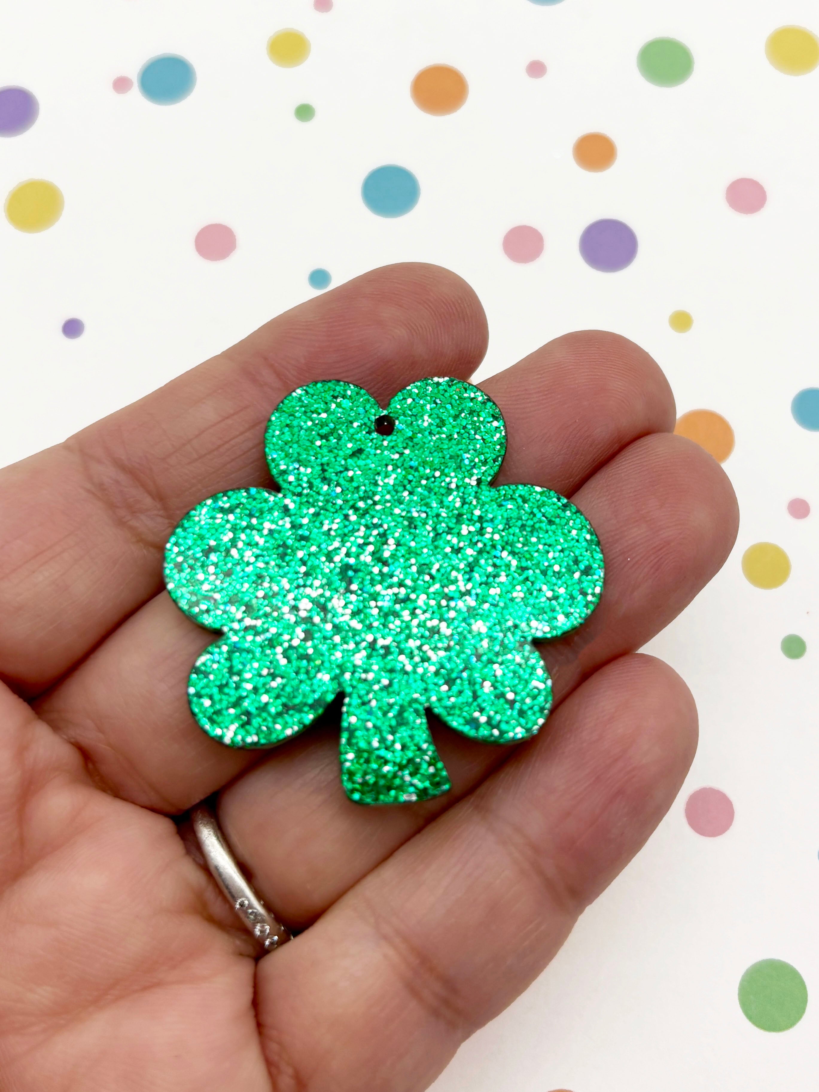 These are green glittery clover charms. They are 37x38x2mm with a 1.6mm hole. You will get 2 pieces.They are perfect for jewelry designs, decoden phone cases, St. Patrick's Day festivities, etc...