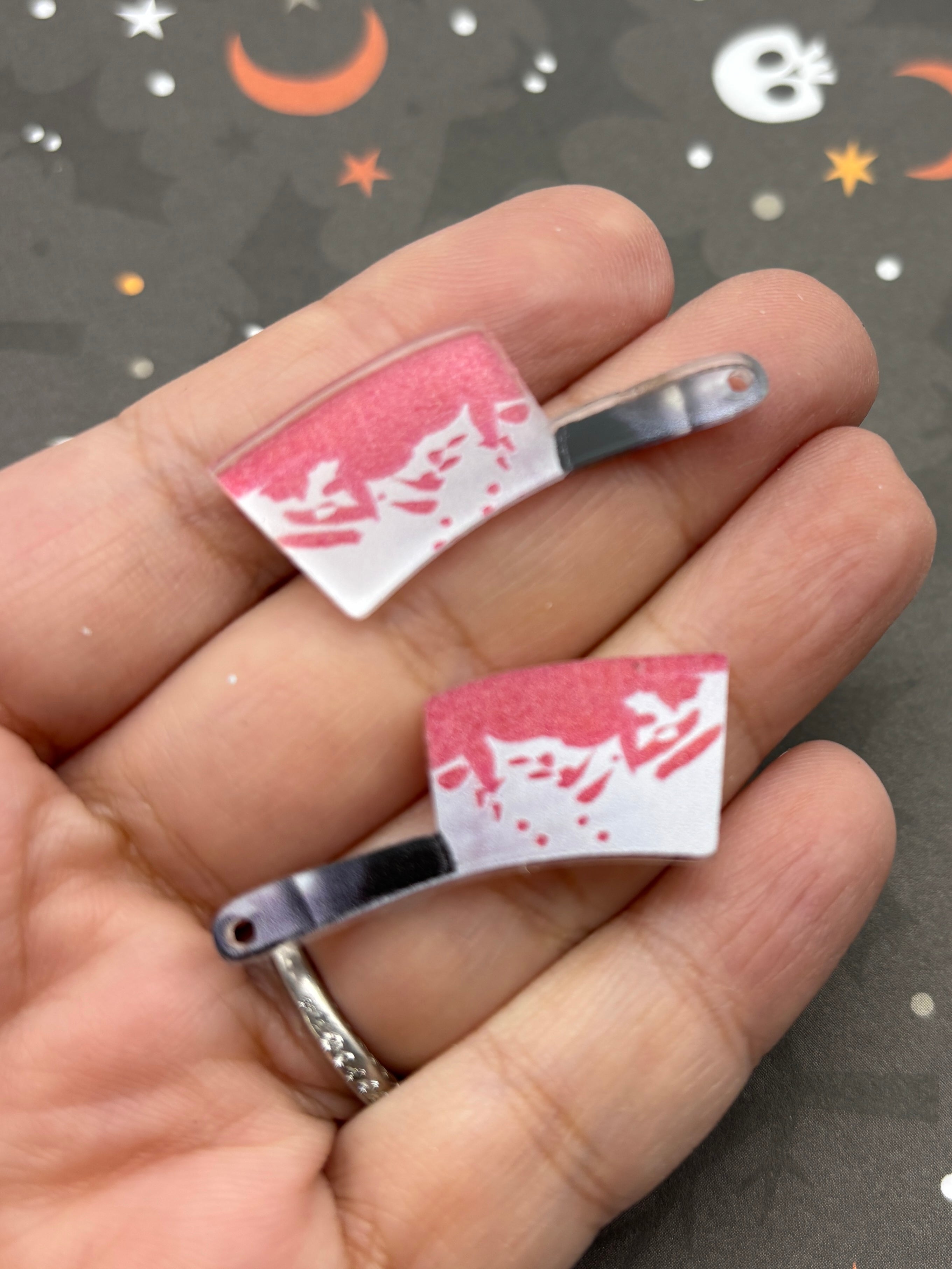 These acrylic miniature knife cabochon charms are fantastic for decoden jewelry and they are also great for making spooky halloween themed crafts. They would also make great dollhouse props! Please note these are not a metallic silver pendant.