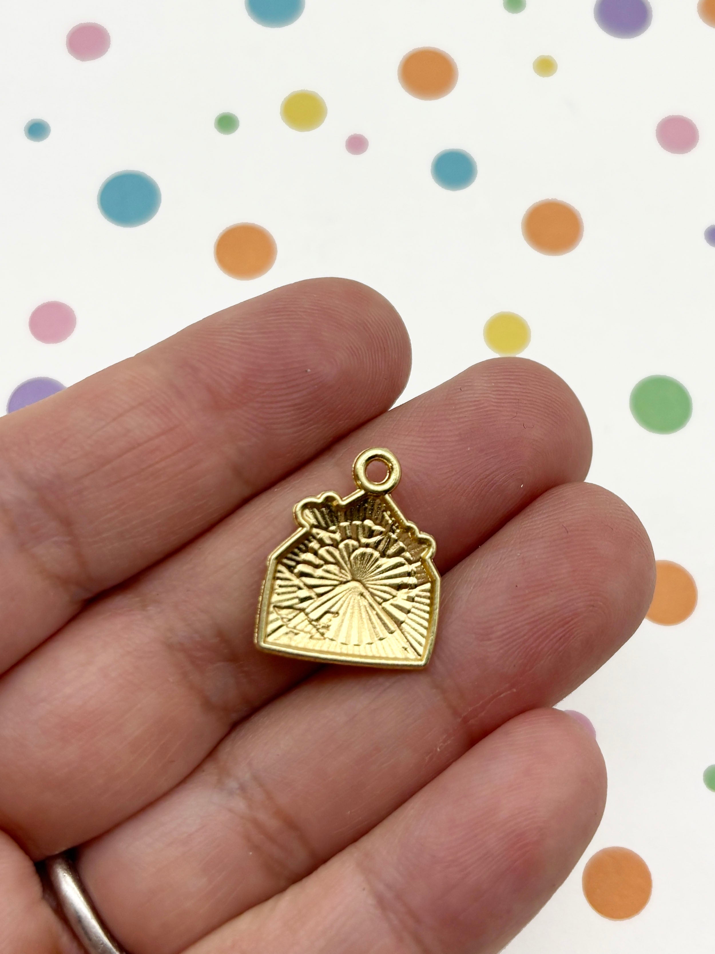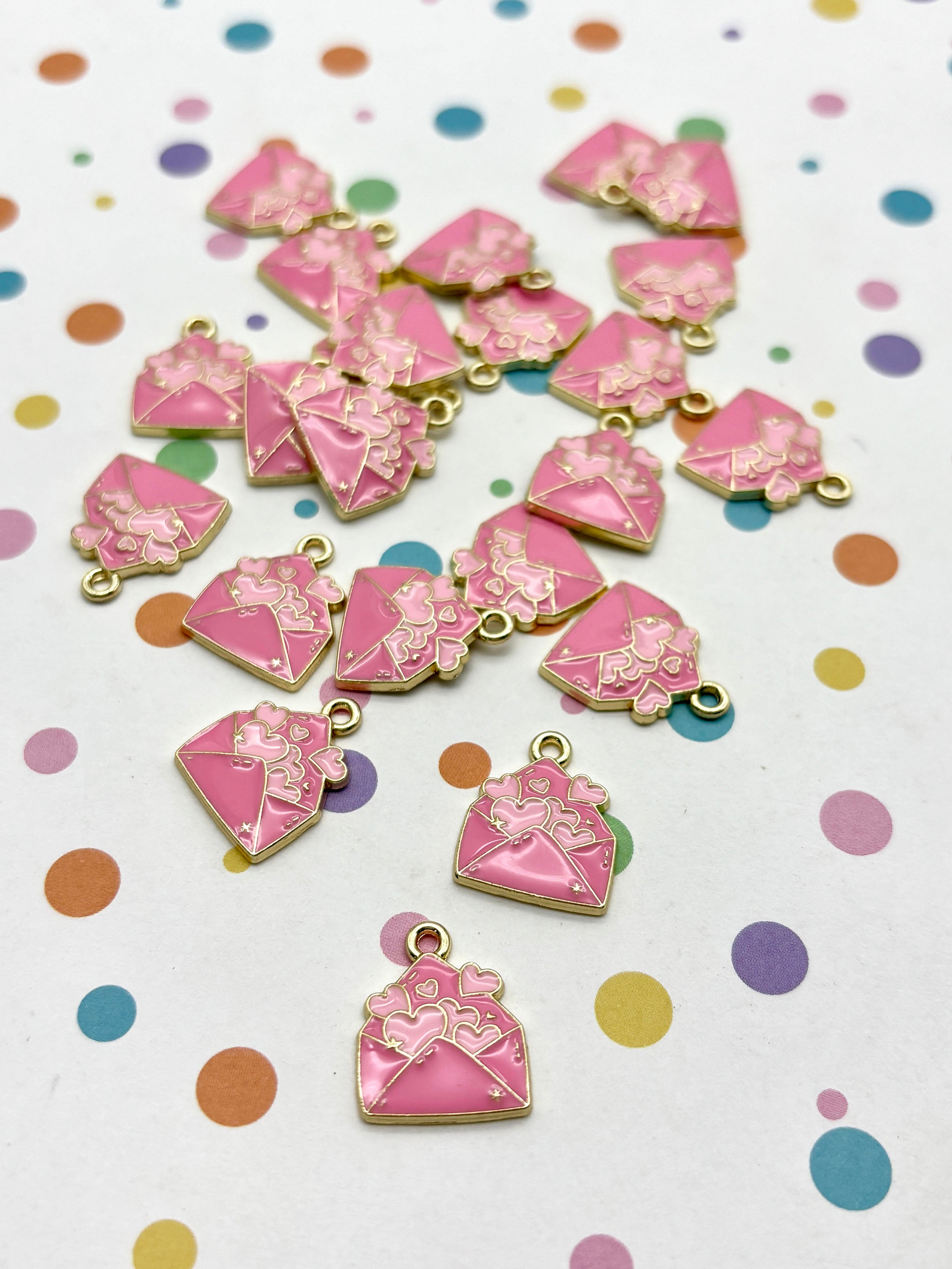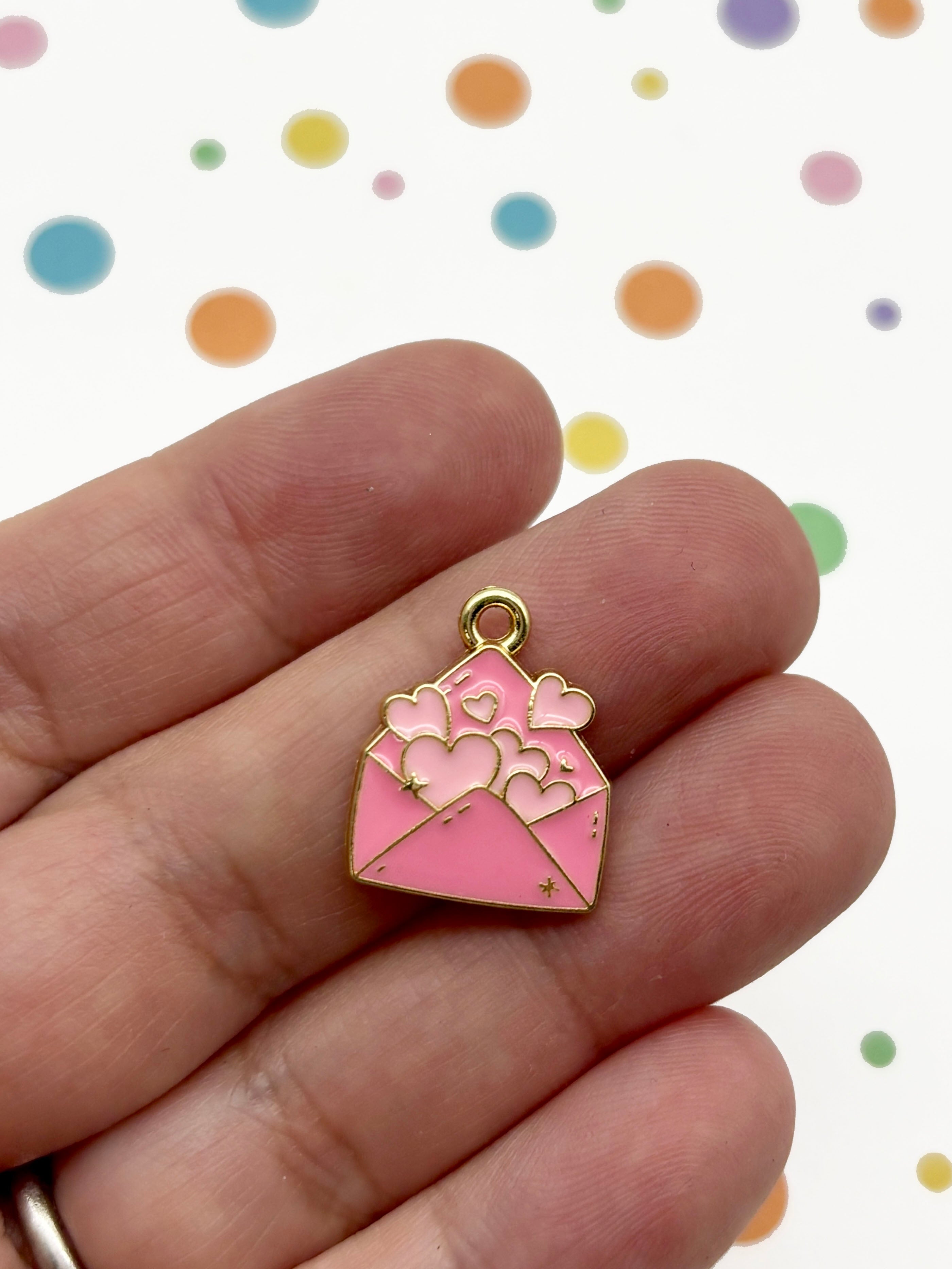 These are enamel Pink Love Letter charms. They are gold tone plated and are 18x15x2.5mm with a 1.8mm hole. You will get 6 pieces!