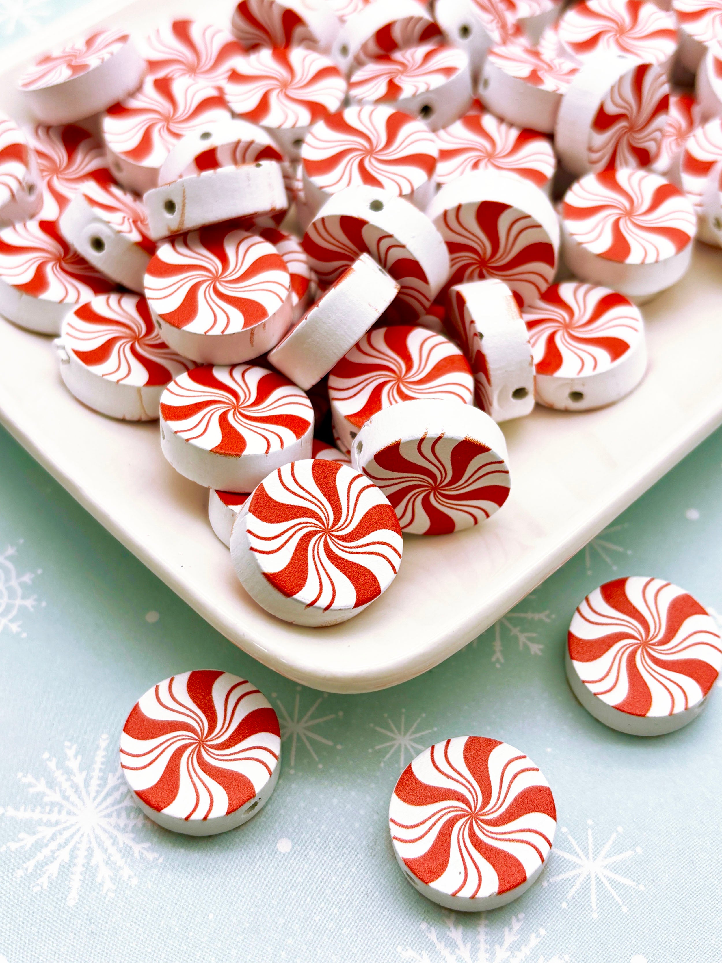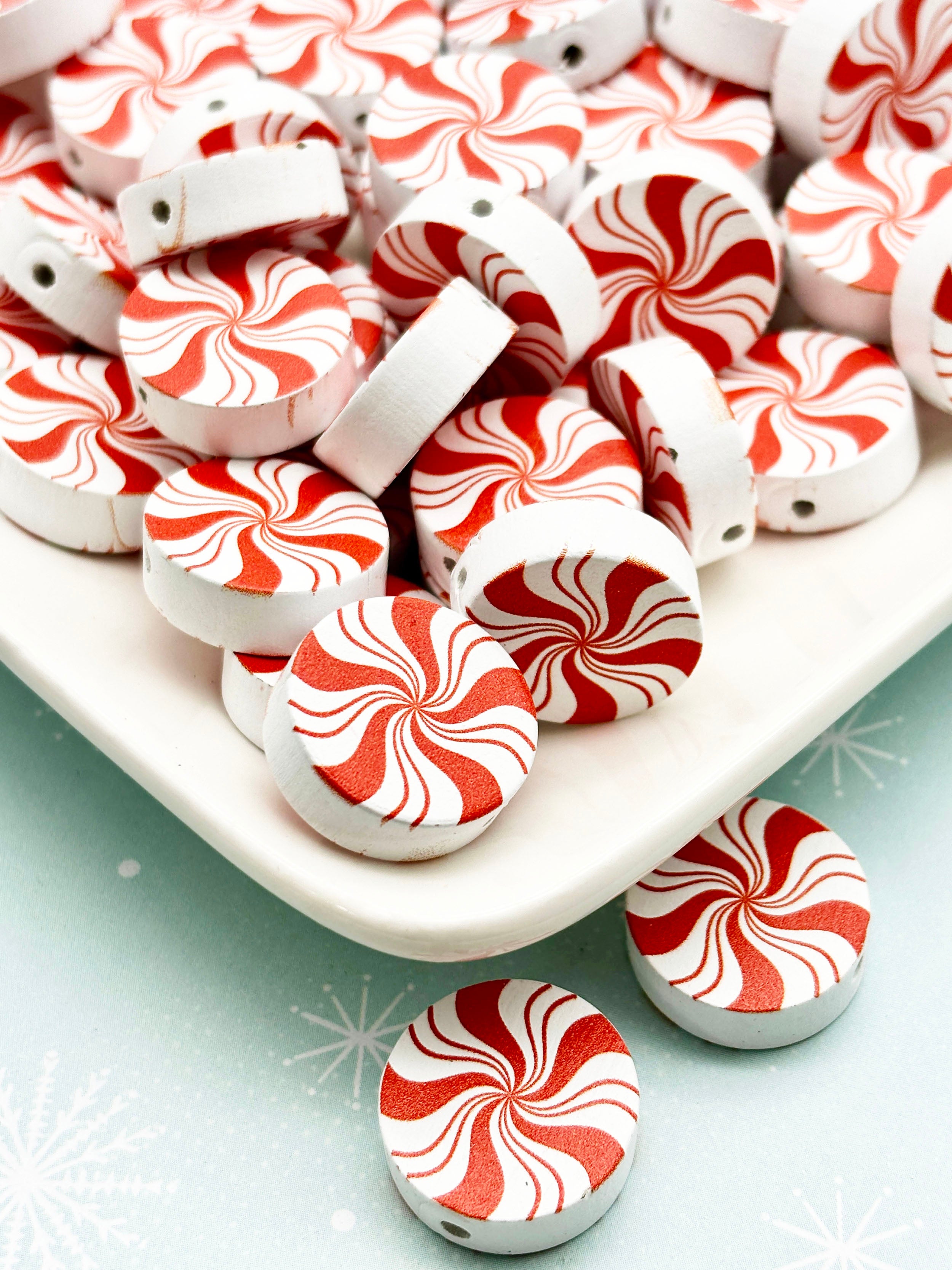10 Red 20mm Flat Round Peppermint Candy Christmas Beads, Xmas Wooden Mint Candies, X-mas Beading Supplies - H510