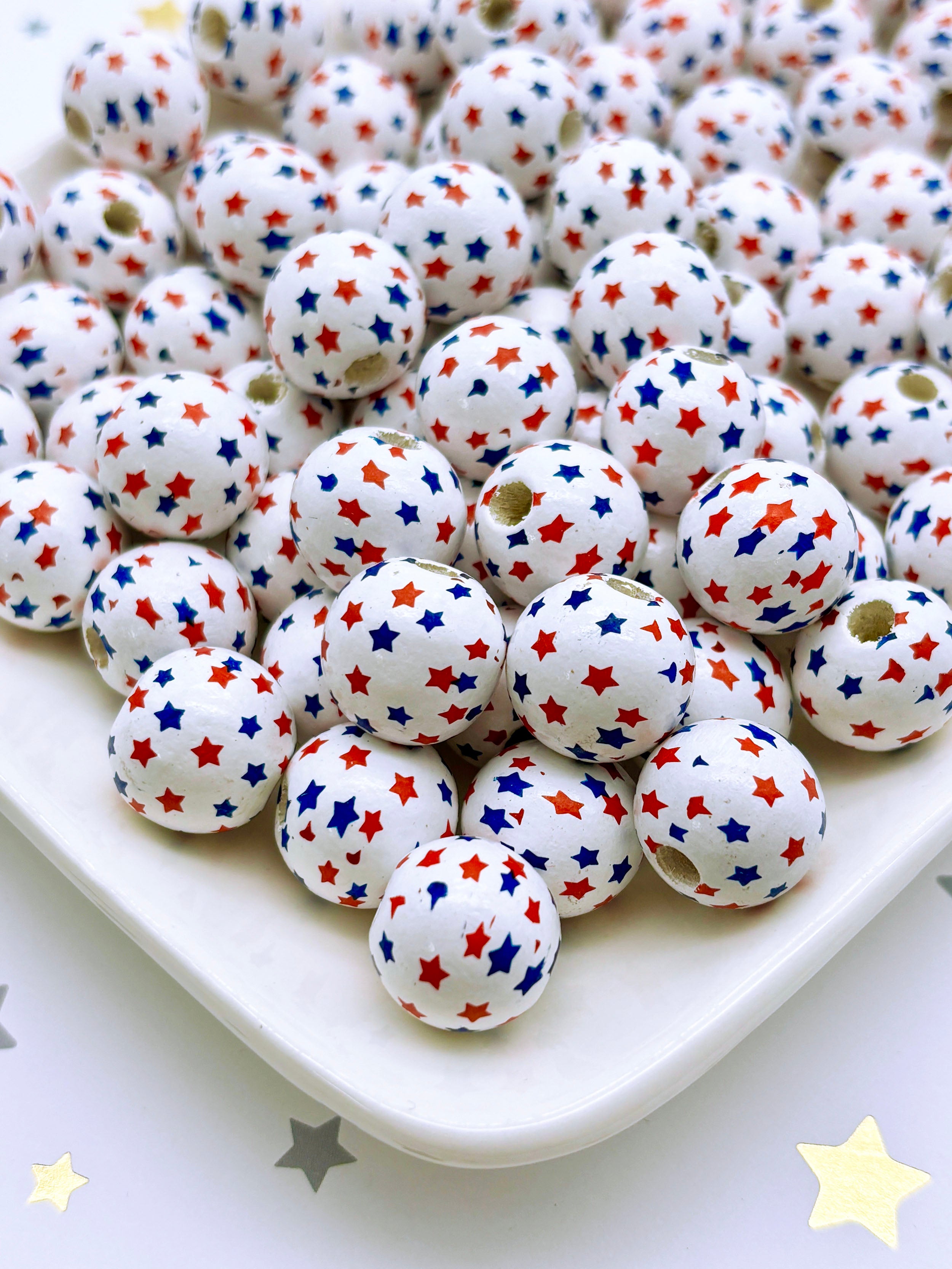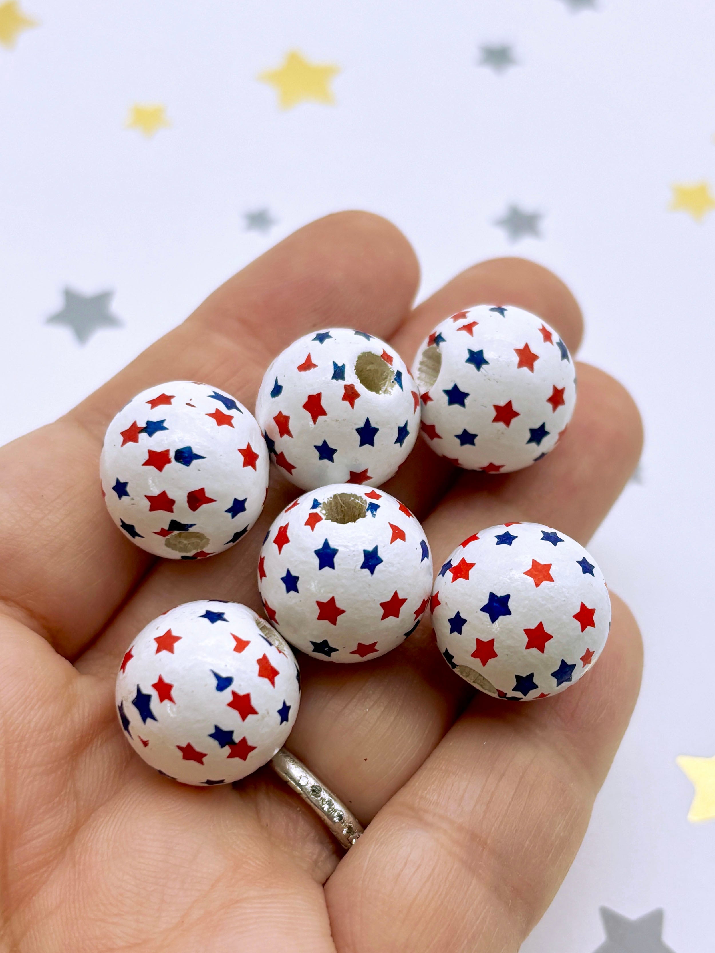 10 Round Red White and Blue 4th of July Gumball Beads 16mm - Festive Wooden Gum Ball Beading Holiday Supplies, H464