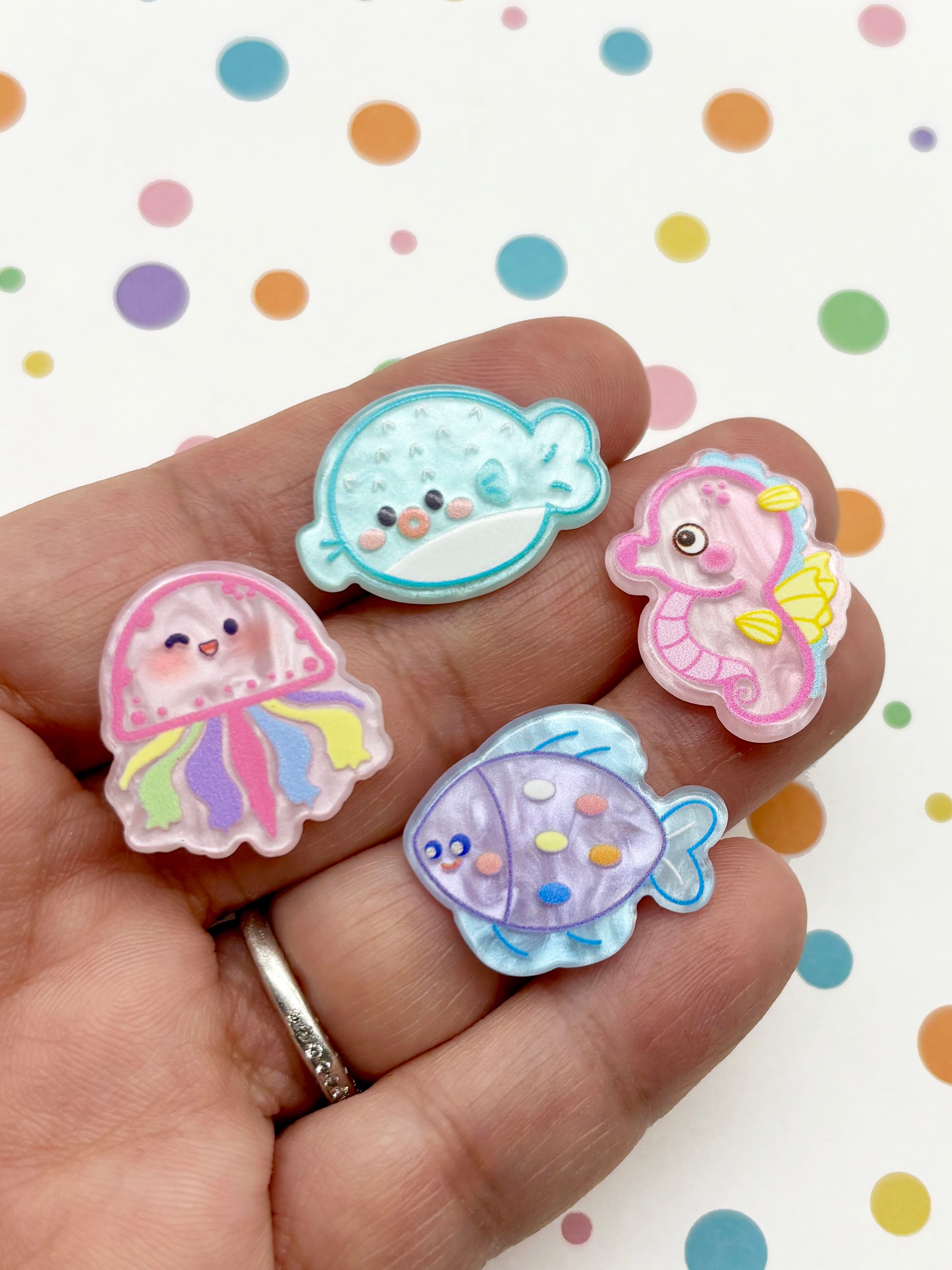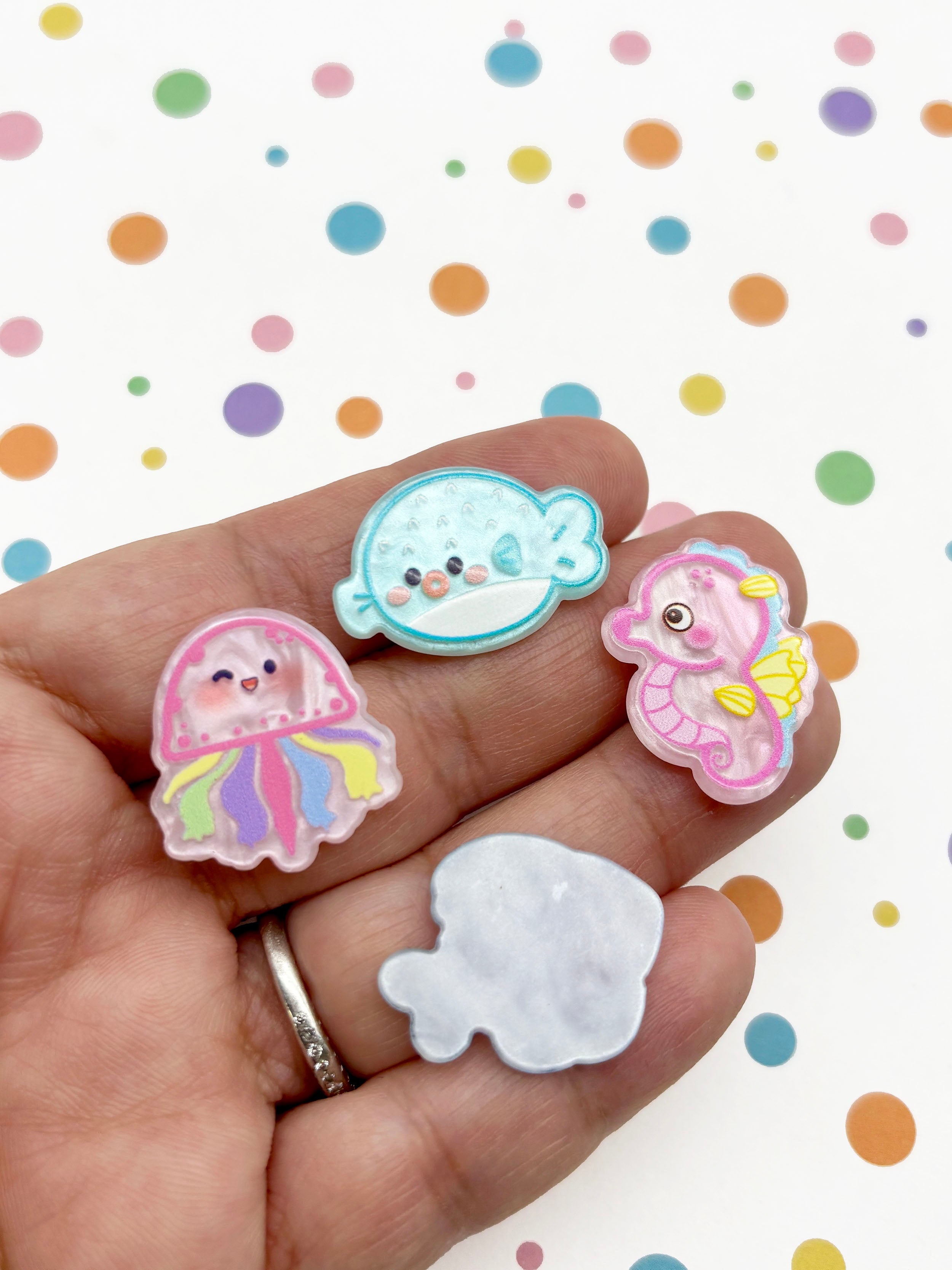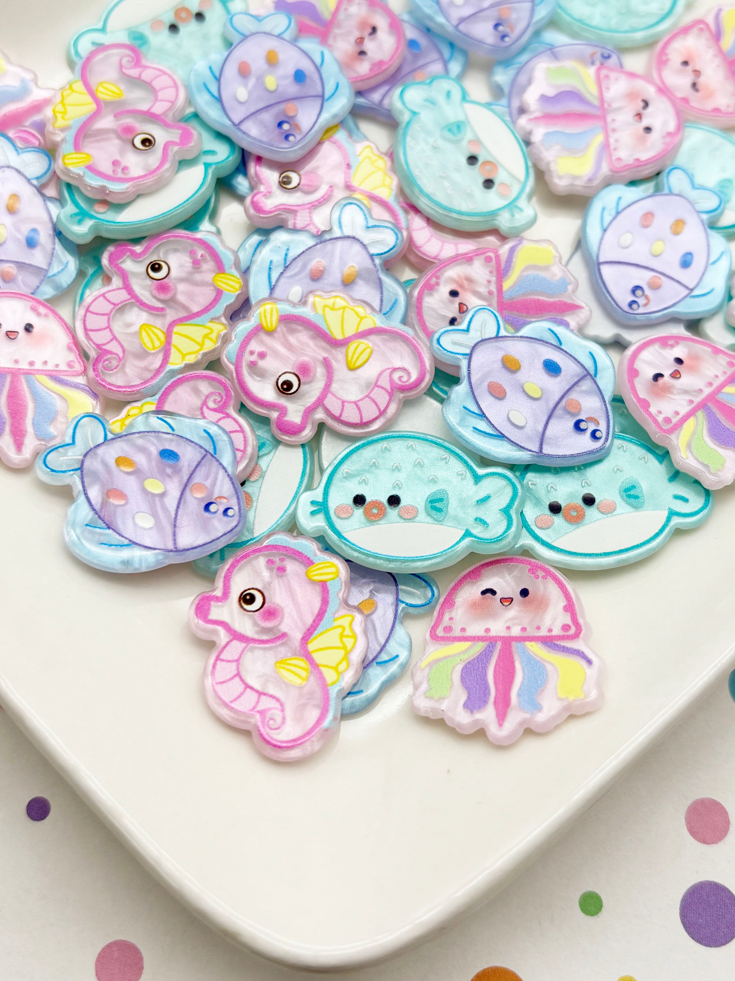 12 Assorted Glittery Pastel Flat Backed Ocean Nautical Resin Cabochons, Flatbacked Acrylic Plastic Cabs 1022
