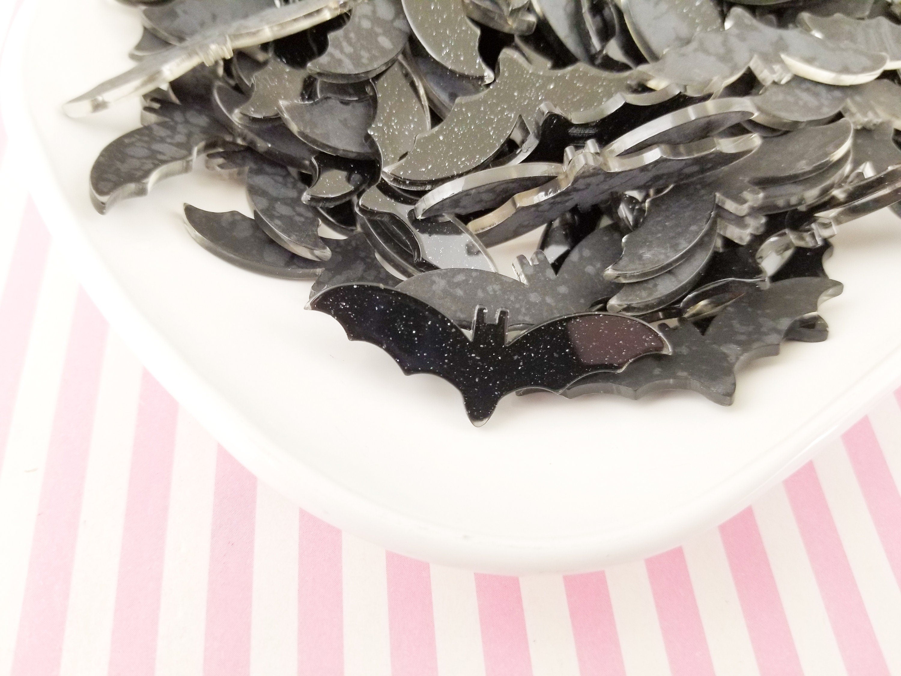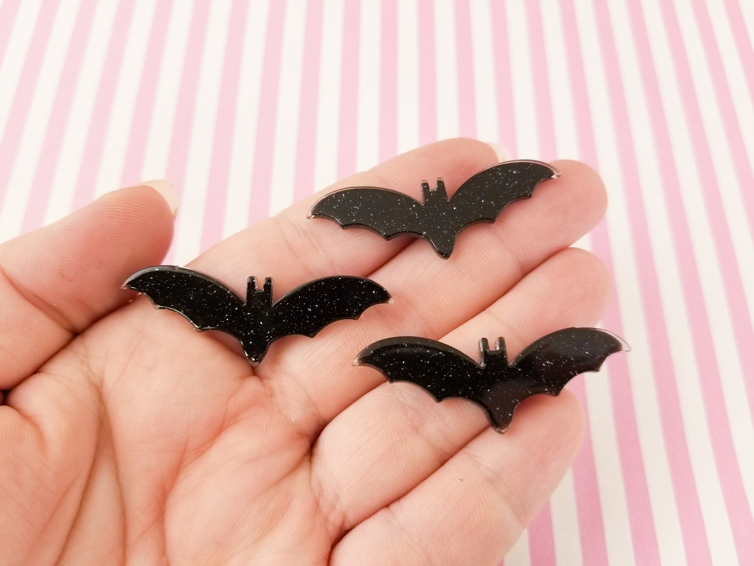 These are fun black glittery bat cabochons that are perfect for all your spooky Halloween craft projects. These are 45x14. You will get 5 pieces!