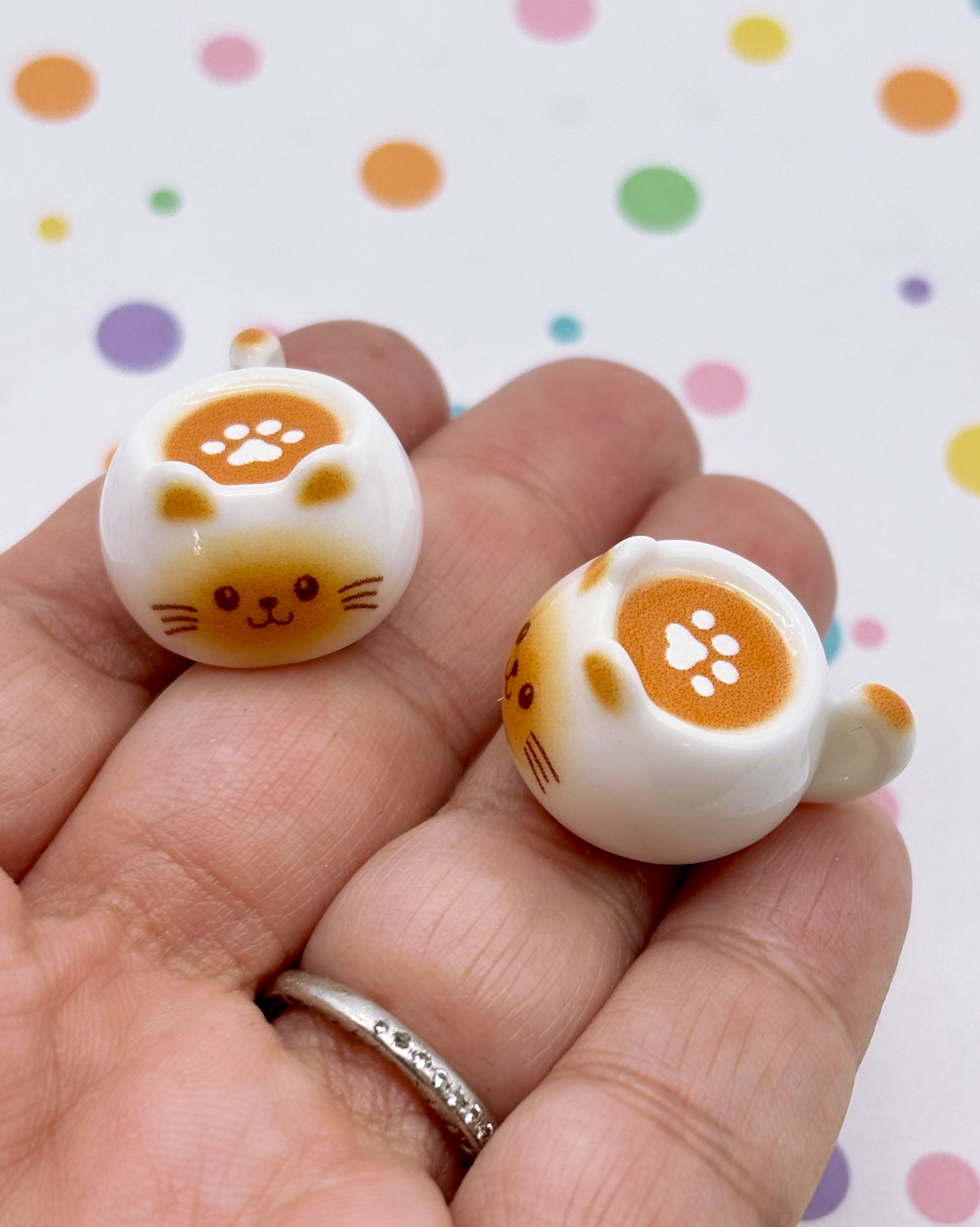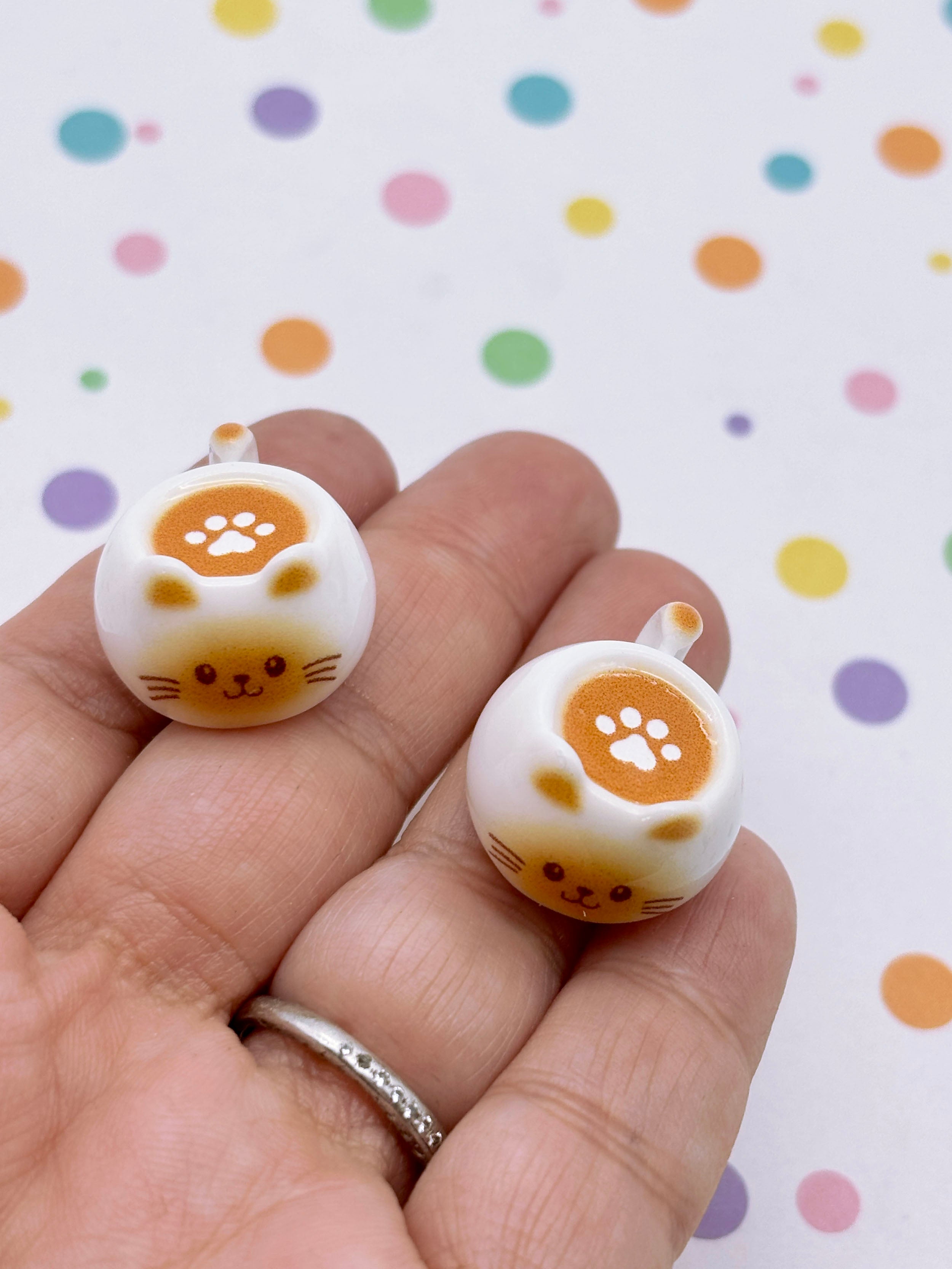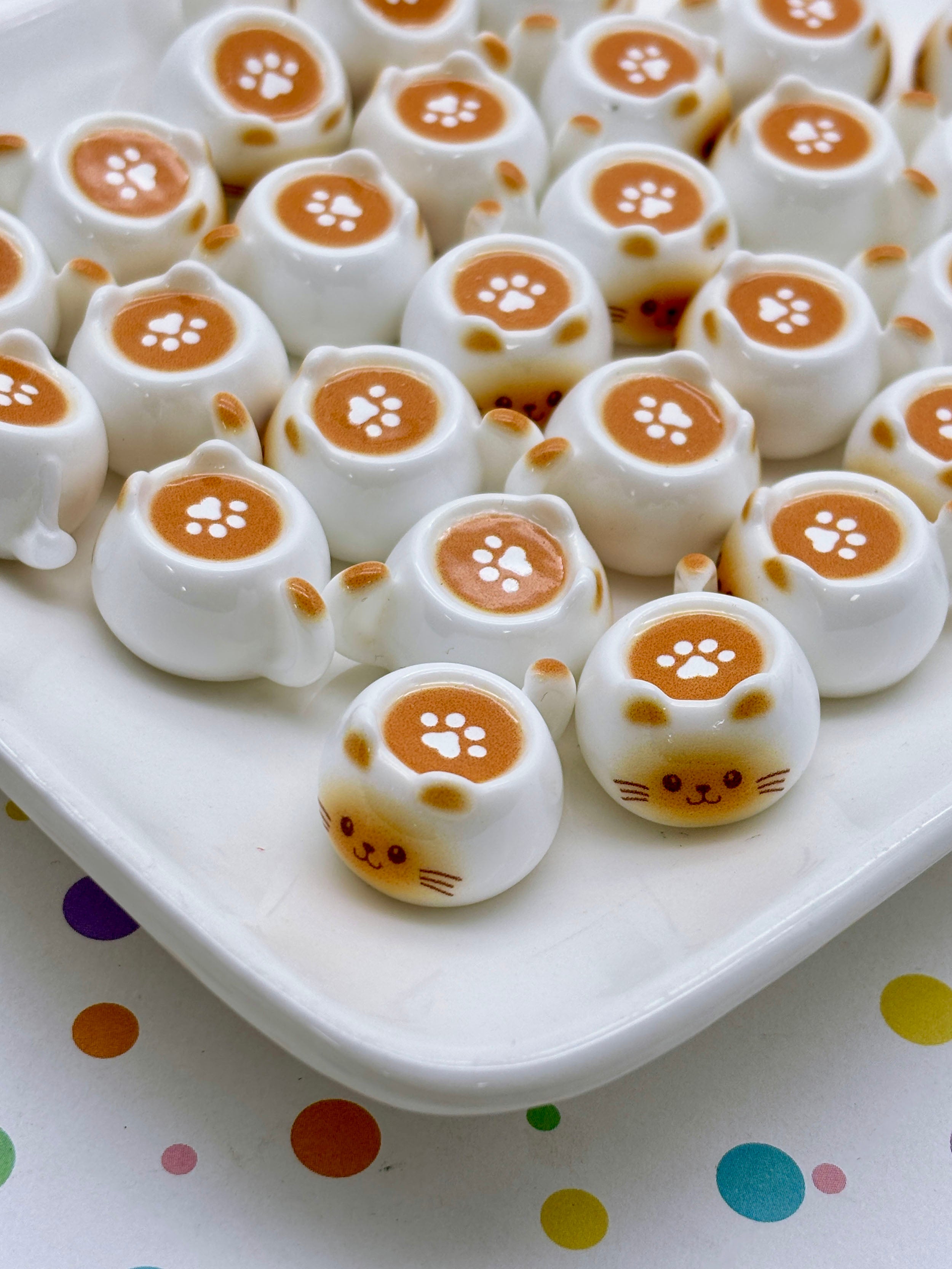 5 Kitty Cat Brown And White Resin Flat Bottomed Cappuccino Coffee Cup Barista Cabochons, Acrylic Plastic 3d Cabs 1015