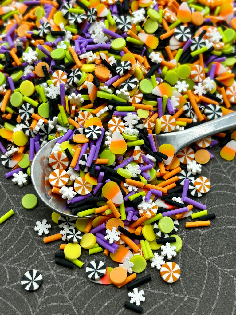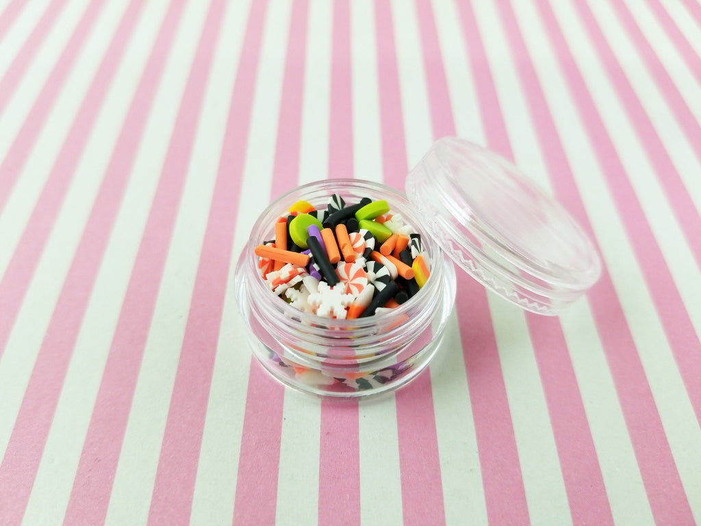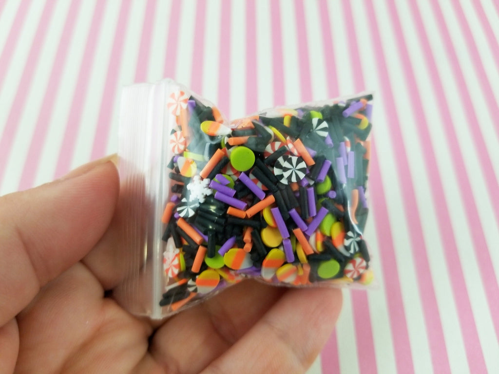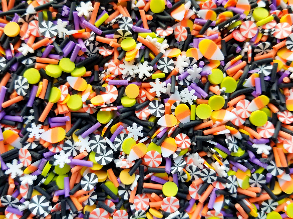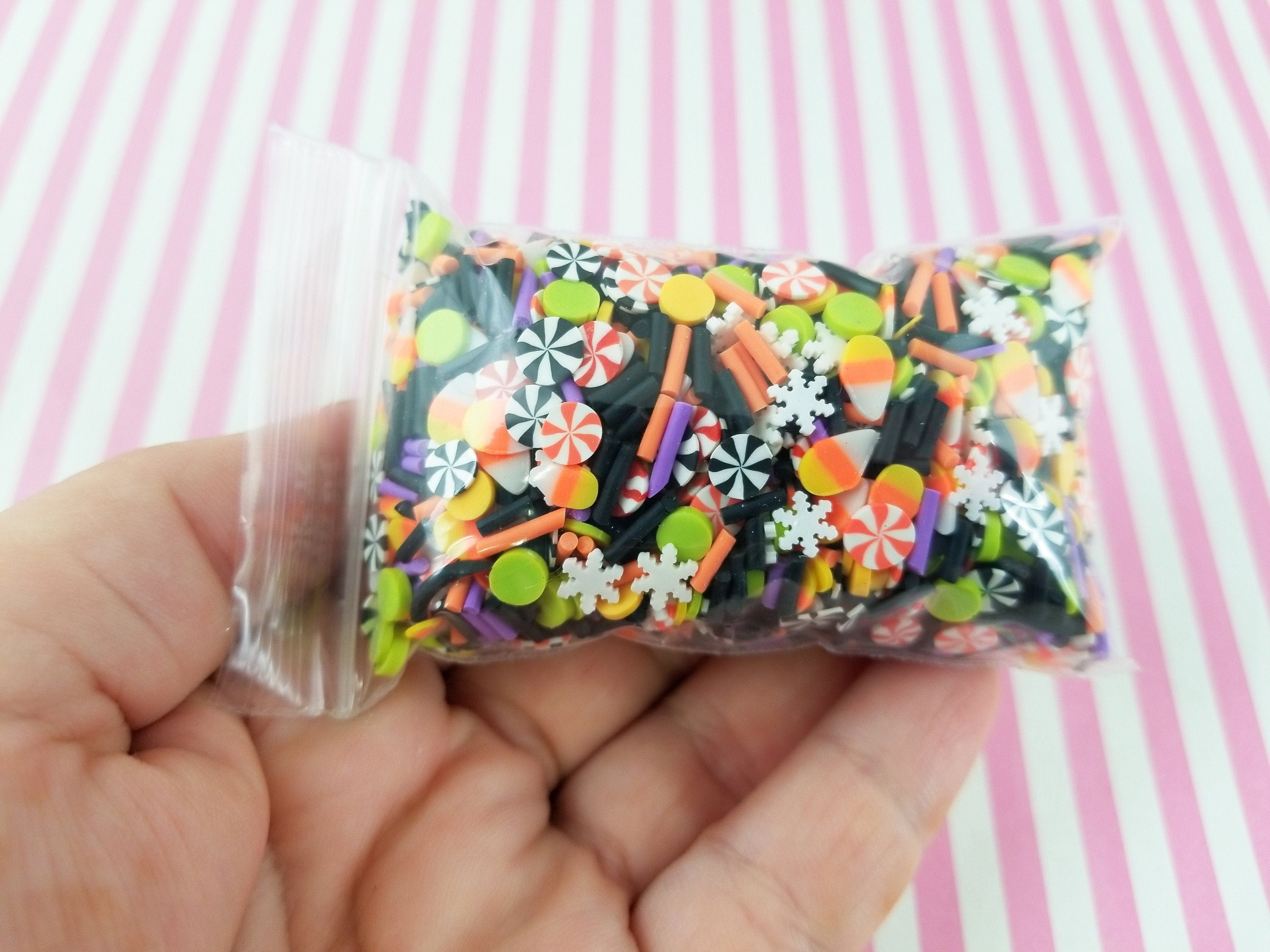 This polymer clay nightmare before christmas inspired pumpkin king mix is a blend of black and bright sprinkles! It would be fantastic in slime and they can add a splash of color to your decoden whipped cream creations. You can also use them in your polymer clay projects as they can be baked again. These are beautiful halloween themed sprinkles!